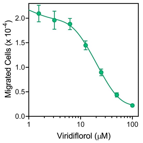Various essential oils and their components have been reported previously to inhibit cell migration [29,48,49]. We found that pretreatment with REOLv for 10 min dose-dependently inhibited fMLF-induced human neutrophil chemotaxis, with an IC50 of 3.3 µg/mL (Table 5). Likewise, the individual constituent compounds viridiflorol, curzerene, spathulenol, and germacrone also inhibited neutrophil chemotaxis, with the most potent compounds being spathulenol and germacrone (Table 5). As an example, the dose-dependent inhibition neutrophil chemotaxis by viridiflorol is shown in Figure 5. In contrast, REOFl and the monoterpene β-phellandrene were both inactive in this assay (Table 5).