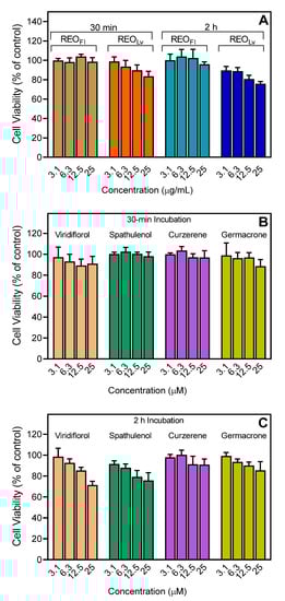 Cytotoxicity of REOLv, REOFl, and selected sesquiterpenes. HL60 cells were preincubated with REOLv or REOFl (A) or pure compounds (B,C) for 30 min and 2 h, and cell viability was analyzed, as described. Values are the mean ± SD of triplicate samples from one experiment that is representative of two independent experiments with similar results.