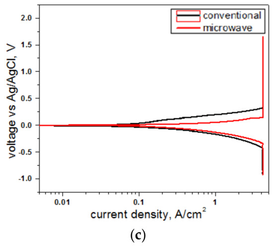 Comparison of the potentiodynamic polarization curves of conventionally and Microwave sintered (a) Al-22.5%Mn, (b) Al-18.6%Cu-24.12%Mn, and (c) Al-20%Cu-15%Mn composites.
