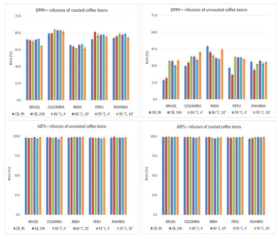 Radical scavenging activity (RSA [%]) of coffee infusions evaluated using DPPH and ABTS methods. Vertical lines represent standard deviation (SD). Details regarding brewing methods are summarized in Table 2.