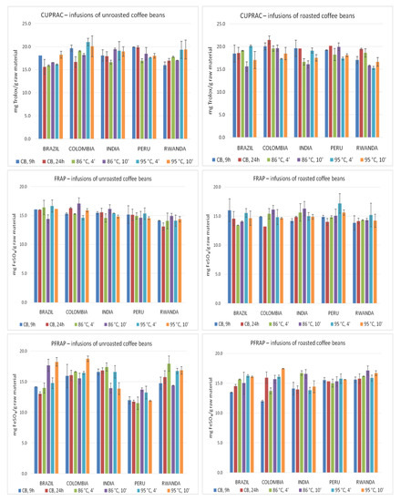 The reduction potential of the infusions was evaluated using the FRAP, PFRAP, and the CUPRAC methods (Figure 2). The highest activity determined by the FRAP method was found for roasted beans from Peru (95 °C, 4 min), while the lowest for the unroasted beans infusion from Rwanda beans (CB, 24 h). Moreover, it was found that activity of extracts from unroasted beans was often higher as compared to infusions prepared from roasted beans. This tendency was especially observed for infusions prepared using the cold brew method. In the case of roasted beans, the highest activity was often observed for coffee beans from India and Peru, and the lowest for beans from Colombia and Rwanda. Moreover, the highest activity evaluated by FRAP method was found for unroasted Brazil and Colombia beans, whereas the lowest for Rwanda coffee. Evaluation of the brewing time effect of roasted and unroasted beans showed that in the case of the cold method and during application water of above 90 °C, a shorter brewing time seemed to be more effective. In the case of the hot brew method using water at a temperature of ~85 °C, brewing for 10 min seems to be more effective. The impact of brewing method on the infusion’s potential showed that the hot brewing technique led to obtain infusions with a higher reduction activity.
