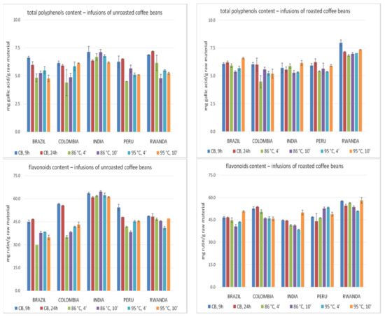 The total polyphenols and flavonoids content in the studied infusions are presented in Figure 3. The highest polyphenols content was found in the Rwanda roasted coffee beans infusion, brewed using the cold brew method for 9 h, whereas the lowest in unroasted Colombian coffee extract prepared during a 4-min brewing (86 °C). Generally, a higher content of polyphenols was found in roasted coffee bean infusions, particularly in those prepared using hot water. The cold brewing method was effective to obtain infusions with high content of polyphenols from unroasted coffee beans. In brews from roasted beans, the highest polyphenol content was found in the Rwanda coffee extracts, while the lowest in Colombian and Indian infusions. In unroasted bean infusions, the highest concentration of polyphenols was found most often in Indian coffee bean brews, while the lowest in Colombian. In the case of roasted beans, the extension of brewing time to 10 min in the hot brewing method usually increased the polyphenols content. However, no similar relationships were observed in the case of green coffee. The obtained results suggest that cold brewing increases the concentration of total polyphenols in infusions, as compared to traditional hot brewing.
