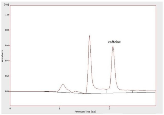 Chromatogram of the determination of caffeine in the infusion of unroasted beans from Peru (temperature of water—84–86 °C, brewing time—4 min).