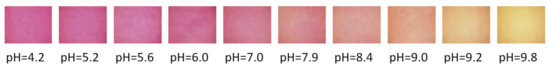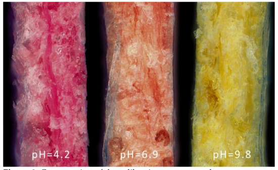The colorimetric pH measurement can be used to measure the geometrical outer surfaces’ pH. This information is important for an assessment of materials’ quality and longevity [6,21,22]; quality testing and management systems of materials [23], biomaterials, natural polymer materials and products such as cellulose, wood, paper [24,25,26,27,28,29,30] and building materials [31]; as well as in medical applications, such as the testing of skin [32,33,34].