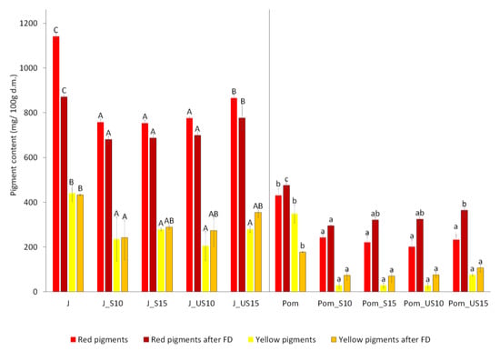 Pigments content. Sample abbreviation: J-Juice, Pom–Pomace, S-Steam, US–Ultrasound, 10, 15–time of pretreatment (min); A–D different capital letters in the each series for juices means statistical difference, a–d different small letters in each series for pomace means statistical difference.