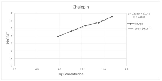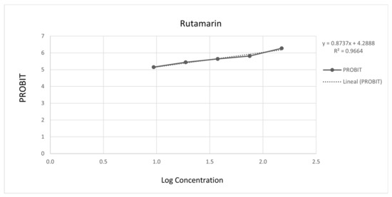 Figure 3 and Figure 4 show the 50% inhibitory concentration of each compound calculated using a probit analysis, considering a 95% confidence level.