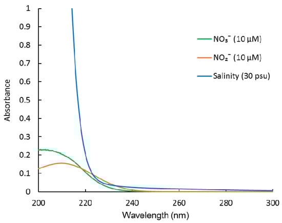Absorption spectra of NO3−, NO2−, and sea salt (salinity).
