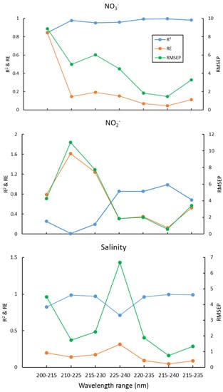 R2, RE, and RMSEP of NO3−, NO2−, and salinity for different wavelength ranges.