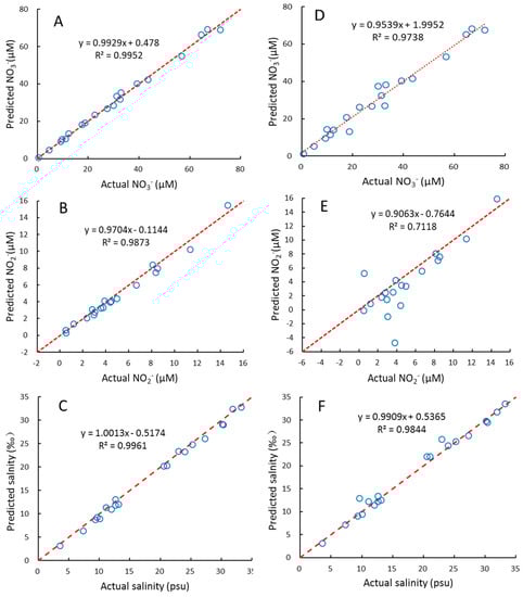The relationships between the actual and predicted NO3−, NO2− and salinity of samples in prediction set using PLS2 model (A–C) and CLS model (D–F). Red dash lines indicate ratio of actual: predicted value = 1:1.