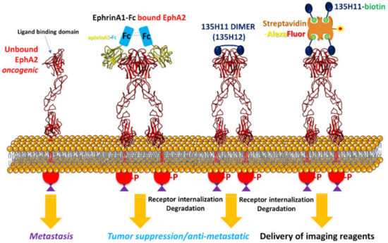 Schematic representation of EphA2 receptor dimerization by agonistic agents. The structures of the EphA4 subtype were used for schematic illustration (PDB IDs 4M4P and 4M4R were used for the apo and ephrinA5 bound, respectively) [38]. Dimeric agents ephrinA1-Fc and 135H12 can efficiently induce dimer formation and receptor activation, internalization, and degradation. The present study evaluates the biotin–streptavidin system (far right) to affect receptor internalization and for its application for imaging and targeted cancer chemotherapy.