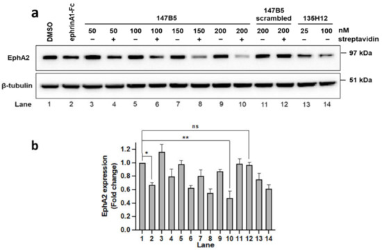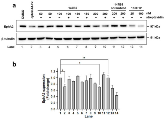 After a brief exposure time (1 h), cell lysates were probed for total EphA2 using an anti-EphA2 antibody (1C11A12; Thermo Fisher Scientific). When tested against MDA-MB-231 breast-cancer cells (Figure 3), control agents ephrinA1-Fc and 135H12 were very effective in causing EphA2 degradation, compared to a vehicle control. In contrast, monomeric 147B5-streptavidin (1:1 ratio 50 nM) was less effective in causing receptor degradation, in agreement with several previous studies indicating that monomeric agents, including 135H11 alone, showed receptor activation only at very high concentrations (100 μM or higher) [5,29,31,35,36,37]. However, increasing the 147B5/streptavidin ratio resulted in dimeric, trimeric, or tetrameric compounds that induced a more sizable reduction of EphA2 levels in exposed cancer cells (Figure 3). In contrast, the negative control tetrameric (147B5-scrambled)4-streptavidin did not alter EphA2 levels (Figure 3). Because receptor activation caused its rapid degradation, we opted to measure total EphA2 levels and not receptor phosphorylation or de-phosphorylation events that would be confounded by overall protein degradation.