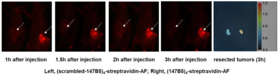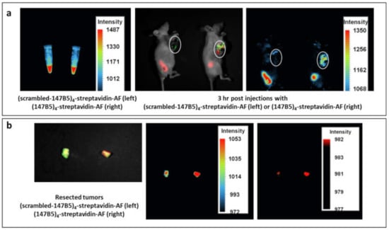 After 21 days (breast cancer) or 35 days (pancreatic cancer), mice received 100 μL, via tail vein, of either (147B5)4-streptavidin-AF or (scrambled)4-streptavidin-AF and images were acquired using the FluorVivo fluorescence imaging system [41]. Images were processed for contrast and brightness and analyzed with the use of IMAGE PRO IMAGE 6.1 software. High-resolution images of 1392 × 1040 pixels were captured directly on a Lenovo PC. Likewise, after euthanasia, tumors were resected and imaged.