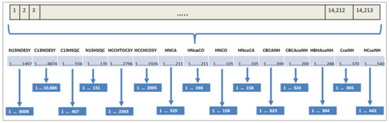 We performed experiments with the NMR dataset of a protein for which an NMR structure determination was completed earlier by conventional methods: the 114-residue Src homology 2 domain from the human feline sarcoma oncogene Fes (Fes SH2) [43,44,45]. We divided this protein into stretches of 30 residues in order to evaluate the behavior of our algorithms in different datasets. As shown in Table 1, we created seven different datasets comprising data from thirty consecutive amino acids each. The starting and ending amino acids 1–10 and 101–114, which include unstructured regions and expression tags, were excluded from the dataset preparation process. We used 11 spectra in each experiment: C13HSQC, CBCANH, CBCAcoNH, CcoNH, HBHAcoNH, HCcoNH, HNCA, HNcaCO, HNCO, HNcoCA, and N15HSQC.