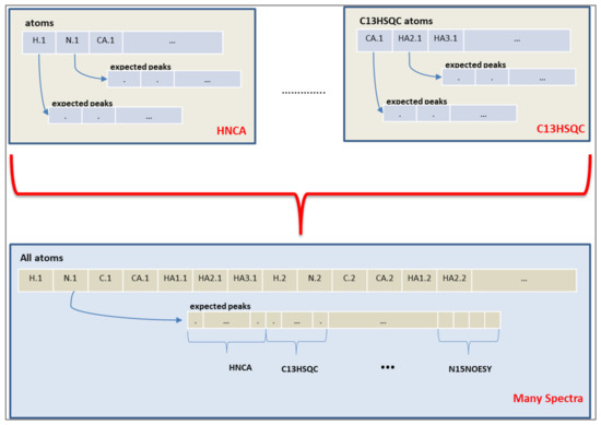The chromosome of the algorithm represents the expected peaks of the experiments. A peak assignment maps one expected peak to a measured peak of that spectrum. However, the objective values are calculated from the chemical shift values of each atom, instead of the peak mappings. Therefore, a connection from the peak mapping to chemical shift values of atoms was established by using the fact that each expected peak involves several atoms depending on the spectrum definition. An atom representation is built and all expected peaks from different spectra are assigned to the atoms, as shown in Figure 4.