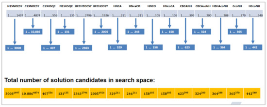 Additionally, the search space for our problem is huge. Each expected peak of a spectrum can be assigned to each measured peak of that spectrum. Figure 5 shows an example of the total number of solution candidates. The first spectrum in this example is N15NOESY with 1497 expected peaks and 3008 measured peaks. This spectrum creates 30081497 solution candidates. The number of solution candidates from other spectra is calculated as shown in Figure 5. The whole search space is composed of the combinations of these solution candidates, which is a huge number.