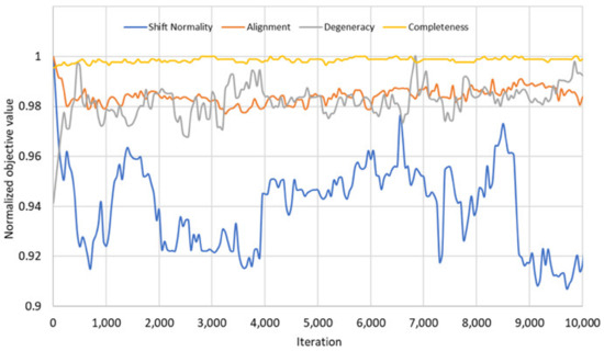 The NSGA3 algorithm could not provide as good results as NSGA2 and GA on our datasets. In order to understand the reason for this behavior, we performed a comparison of the objectives as follows. There are four objectives in our problem model: shift normality, alignment, completeness and low degeneracy. Since the MOEA framework can only work with minimization problems, the objectives of Equation (2) are defined with a negative sign, where necessary. The goal of our algorithms is to minimize these objective values.