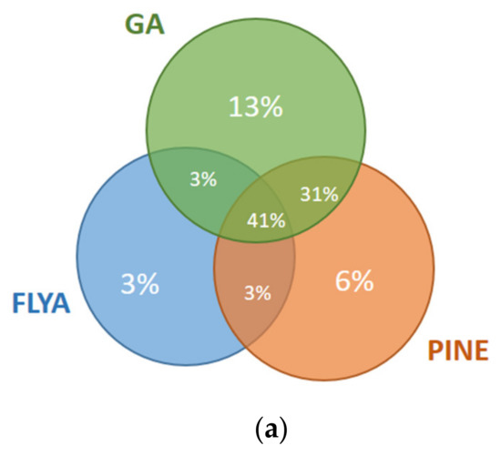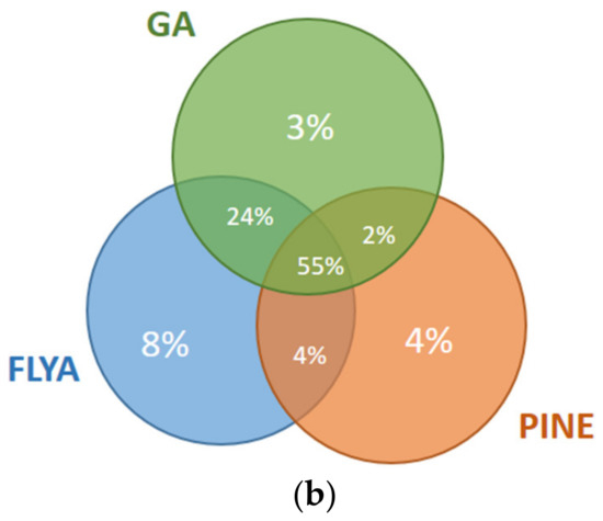 The results for the first and fourth fragments of the Fes SH2 protein are illustrated in Figure 8. For the first fragment (Figure 8a), 10% of the atoms were assigned correctly only by our GA algorithm but not by PINE or FLYA. A total of 3% of the atoms were assigned correctly only by FLYA and 6% of the atoms only by PINE. Our GA algorithm and FLYA simultaneously assigned 3% of the atoms correctly, where 34% of the atoms were assigned only by PINE and our GA algorithm. A total of 41% of the atoms were assigned simultaneously by our GA algorithm, FLYA and PINE correctly. As seen in the results of the fourth fragment (Figure 8b), 3% of the atoms were assigned correctly only by our GA algorithm but not by PINE or FLYA. A total of 8% of the atoms were assigned correctly only by FLYA and 4% only by PINE. Our GA algorithm and FLYA simultaneously assign 13% of the atoms correctly, where 2% of the atoms were assigned only by PINE and our GA algorithm. A total of 66% of the atoms were assigned correctly simultaneously by our GA algorithm, FLYA and PINE.