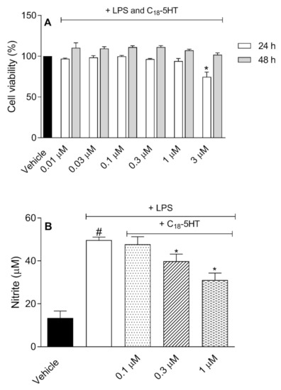 Effect of C18-5HT on cell viability (A) and NO production (B) in a RAW 264.7 cell line. In A, cells were incubated with vehicle or C18-5HT (0.01–3 µM) and further incubated with lipopoly, (1 μg/mL) for 24 or 48 h. Cell viability was measured with an MTT assay. In B, cells were incubated with vehicle or C18-5HT (0.1–1 µM) and further incubated with LPS (1 μg/mL). After 24 h of incubation, nitrite concentration in the supernatant was measured with Griess reagent. The results are expressed as mean ± SD (n = 3) from three independent experiments. In (A), * p < 0.05 when compared with the vehicle-treated group. In (B), * p < 0.05 when comparing the C18-5HT-treated group with LPS-treated group or # p < 0.05 when comparing the LPS-treated group with the vehicle-treated group.