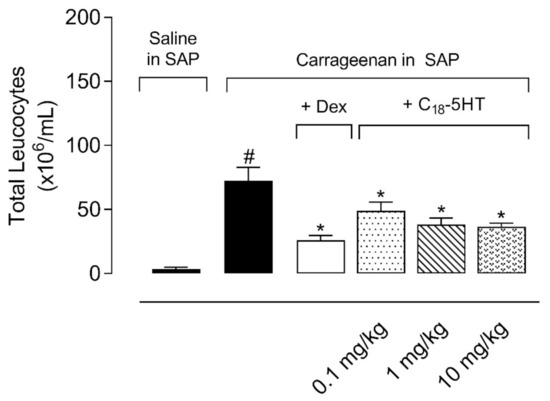 Carrageenan-induced cell migration was performed according to Raymundo et al. [48]. The mice’s backs were injected subcutaneously with 10 mL of sterile air. Three days later, a new injection with 8 mL of sterile air was made to guarantee the maintenance of the cavity in the animal’s back. On the sixth day, the animals were treated orally with the vehicle, C18-5HT (0.1, 1,or10 mg/kg) or intraperitoneally with dexamethasone (2.5 mg/kg) 60 min before receiving 1 mL of a carrageenan solution (1%). After 24 h of carrageenan injection, the animals were euthanized with chloral hydrate (1%, i.p.), and the cavity was flushed out with 1 mL of PBS.Exudates were collected and centrifuged at 1200 rpm for 10 min at 4 °C, and samples were stored at −20 °C until the quantifications. The total leucocytes cells counts were determined in the exudates using a pocH-100iV Diff (Sysmex) hematology analyzer.