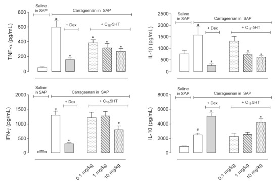 We subsequently measured the levels of some cytokines (i.e., TNF-α, IL-1β, IL-10, and IFN-γ) in the exudates collected in SAP after the treatment of mice. Figure 5 shows that carrageenan causes a significant increase in levels of all four cytokines 24 h after its injection in the SAP. The pretreatment of mice with dexamethasone (2.5 mg/kg, i.p.) reduced by more than 50% the levels of TNF-α, IL-1β, and IFN-γ (599.7 ± 8.9 pg/mL in the carrageenan group versus 257.8 ± 21.8 pg/mL, 282.9 ± 62.6 pg/mL, and 325.4 ± 33.1 pg/mL of each cytokine, respectively), and increased production of IL-10 by almost 100% (2525 ± 215.7 pg/mL in the carrageenan group versus 5051 ± 431.4 pg/mL in the dexamethasone-treated group). Although all doses of C18-5HT (0.1, 1, or 10 mg/kg, p.o.) significantly reduced TNF-α levels (55.98 ± 8.9 pg/mL in the saline-injected group versus 599.7 ± 83.15 pg/mL in the carrageenan-treated group, and 396.1 ± 40.7 pg/mL, 317.1 ± 58 pg/mL, and 271.5 ± 36.15 pg/mL to 0.1, 1, and 10 mg/kg doses, respectively), only the two higher doses inhibited IL-1β production (768.5 ± 149.4 pg/mL in the saline-treated group versus 1584 ± 350.7 pg/mL in the carrageenan-treated group and 1323 ± 192.3 pg/mL, 733.8 ± 69.1 pg/mL, and 622.9 ± 53.18 pg/mL to 0.1, 1, and 10 mg/kg doses, respectively). Regarding the cytokine IFN-γ, only the dose of 10 mg/kg demonstrated a significant effect (62.5 ± 25.5 pg/mL in the saline-treated group versus 1302 ±132.6 pg/mL in the carrageenan-treated group and 1212 ± 185.6 pg/mL, 1273 ± 151.2 pg/mL, and 808 ± 128.2 pg/mL to 0.1, 1, and 10 mg/kg doses, respectively). The 10 mg/kg dose also increased IL-10 production and accumulation in the exudate (905.6 ± 59.2 pg/mL in the saline-treated group versus2525 ± 215.7 pg/mL in the carrageenan-treated group and 4214 ± 453.8 pg/mL in 10 mg/kg) (Figure 5).
