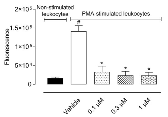 Leukocytes collected from SAP were placed in tubes (1 × 106 cells/mL) and incubated for 1 h (37 °C and 5% CO2). After incubation with C18-5HT (0.1, 0.3, and 1 µM) for 30 min and stimulated with phorbol myristate acetate (PMA, 10 nM) for 45 min, DCF-DA (2′-7′diclorodihidrofluorescein diacetate, 2 mM) was added, and the cells were incubated for 30 min (37 °C and 5% CO2) [51]. The emitted fluorescence was captured in the FL-1 channel flow cytometer (BD Accuri™, B&D, Franklin Lakes, NJ, USA) and was expressed as DCF-DA fluorescence.