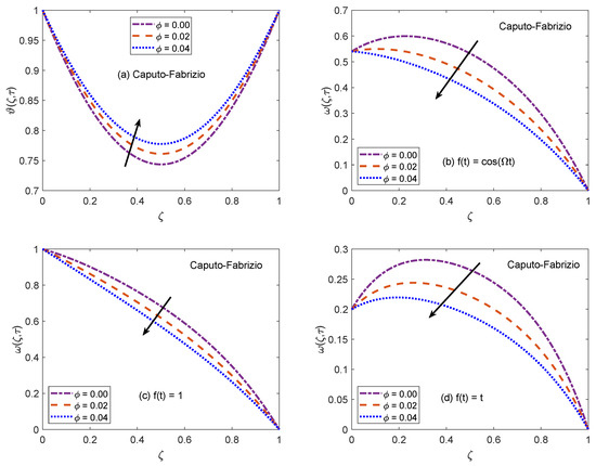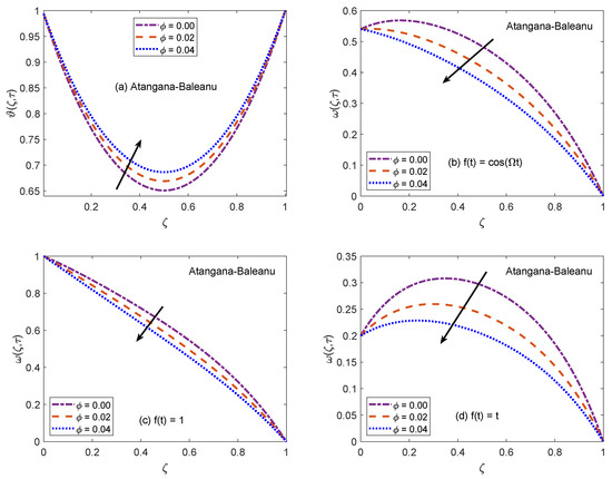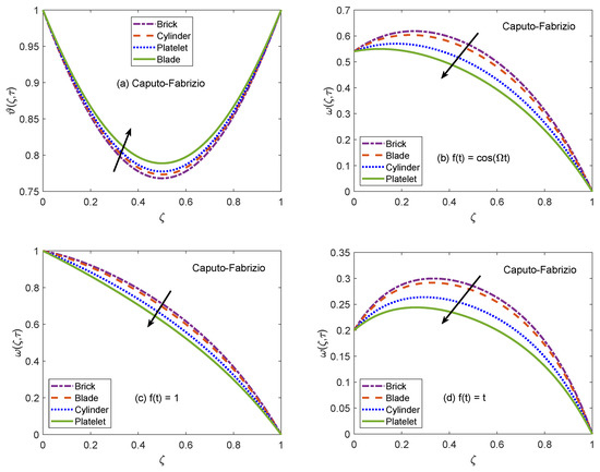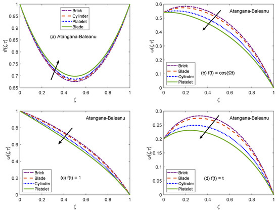Figure 2 and Figure 3 communicate the profiles of energy and velocity distributions for AB and CF operators based models. Furthermore, the impacts of shape factor are also studied through these figures. It is observed that nanofluid possesses the minimum energy function for brick shaped nanoparticles and this function attains the highest value when nanoparticles of blade shapes are dispersed. Mainly, this variation is caused by shape factor j. In the physical sense, thermal conductivity of nanofluid changes because j has a particular value for a specific shape of nanoparticles (as expressed in Equation (8)). Hence, corresponding to change of shapes, the thermal profile of nanofluid indicates a noteworthy variation, which highlights that shape factor plays a significant contribution in the development of temperature field. Furthermore, the CF model yields higher temperature profile as compared to that of AB model. Now, moving towards transport phenomenon, the flow of nanofluid is investigated for three different physical situations. Figure 2b and Figure 3b are for the case when the left wall shows oscillatory motion (), Figure 2c and Figure 3c are for the constant motion (), and Figure 2d and Figure 3d are for the condition when the wall moves with single acceleration (). It is perceived that the addition of platelet shaped nanoparticles causes a substantial retardation in the flow velocity. Whereas, the swiftest flow of nanofluid is observed for brick shapes nanoparticles. The primary factor behind this behavior is modification of viscosity due to shape constants and . Every shape of nanoparticles specifies fixed values of and , which lead to defining the viscosity of nanofluid. An interesting fact is witnessed here that the velocity function exhibits the highest profile when the left wall indicates a constant motion. The whole discussion about Figure 2 and Figure 3 can be summarized in the following way that the values of flow and temperature functions are maximum for brick and blade shapes of nanoparticles respectively. The experimental investigation of Timofeeva et al. [50] supports the aforementioned results. They observed that the flow velocity of nanofluids is maximum when the dispersed nanoparticles are of brick shape because the flow resistive capacity of nanofluids is minimum in this case. Furthermore, an investigation on different shapes of nanoparticles was conducted by Khan [51] and the results of this study show a perfect agreement with the present work. He analyzed that nanofluid with blade and platelet shape nanoparticles indicate higher thermal profiles as compared to cylinder and brick shape nanoparticles. The total concentration of nanoparticles in base fluid is denoted by . Figure 4 is developed to analyze the behavior of temperature and flow functions when this concentration is increased to 4% (). The respective figure is prepared for AB model and the same analysis is carried out for CF model through Figure 5. It is realized that temperature and flow functions behave in reverse manners. More precisely, the thermal curve is elevated for larger values of whereas, the flow curve is declined. One of the vital features of nanoparticles is that they enhance the thermal properties of ordinary fluids. Heat capacitance and thermal conductivity are examples of these properties. So, in the current case, when nanoparticles are added in base fluid sodium alginate, the potential of resulted nanofluid to conduct the heat is much greater as compared to that of pure sodium alginate. Therefore, the thermal curve of nanofluid is higher than the curve of pure fluid (). On the other end, these nanoparticles also affect the physical characteristics of conventional fluids such as viscosity and density. In general, the addition of nanoparticles produce more viscous nanofluids. Similarly, it is seen that pure sodium alginate has greater velocity as equated to velocity of based nanofluid. It is also clear that effects of variation are significant when the wall moves with single acceleration. Moreover, it is important to discuss here the experimental work of Colla et al. [52]. They performed experimental studies to anticipate and analyze the modifications in the host fluid’s viscosity because of the addition of nanoparticles. They reported a significant rise in thermal conductivity and viscosity of consequent nanofluid due to an enhancement in the loading range of nanoparticles. This conclusion also endorses the opposite behaviors of thermal and flow profiles of the nanofluid considered in the under observation problem. These results highlight the useful applications of nanofluids for thermal management of devices, lubrication, and cooling of advanced industrial operational systems.