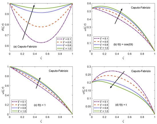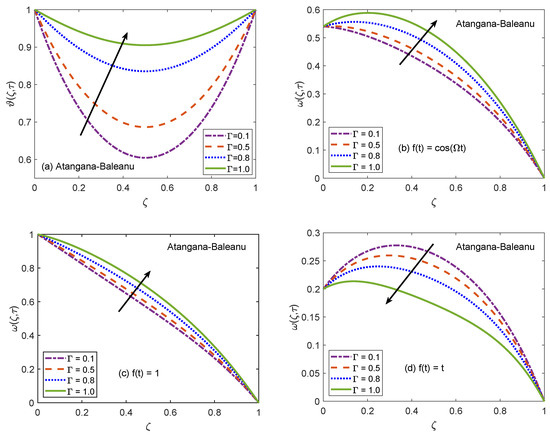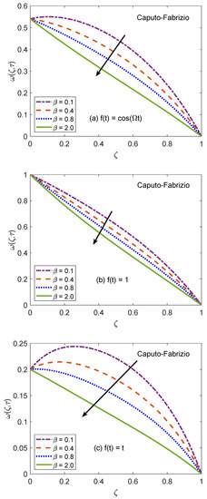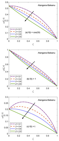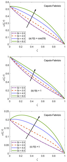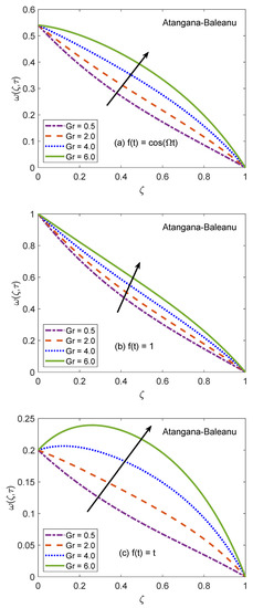 The behavior of velocity patters corresponding to the variation of Casson parameter () for AB and CF models is portrayed in Figure 10 and Figure 11. In the physical sense, parameter explains the plasticity nature of Casson-type nanofluids. It is remarked that the flow of nanofluid is decelerated for growing magnitudes of because the plasticity effects become dominant when increases and cause an attenuation in the boundary layer. Moreover, corresponding to a larger value of , the considered nanofluid becomes thicker and its ability to resist the deformation enhances significantly. As a consequence, the viscous effects suppress the influence of flow-favoring factors and a decline in the velocity of nanofluid takes place. Resultantly, the flow function exhibits a decay in the corresponding curve. It is essential to state that non-Newtonian features of fluid disappear for a sufficiently large magnitude of and it acts as a Newtonian fluid. This finding also discloses that the velocity boundary layer of Casson fluid is thicker as equated to that of viscous fluid. Furthermore, the consequences of varying the value of are not uniform for three different flow conditions. Figure 12 and Figure 13 are featured to characterize the contribution of Grashof number in the establishment of flow patterns. For the flows involving free convection, is studied to quantify the effects of viscous and buoyancy forces. An increment in specifies supplementary heating of the channel, which leads to several changes in the flow region. For instance, there is a considerable variation in particular weights of neighboring layers of nanofluid. Moreover, it eventuates a change in the density and reduction of internal friction. The figures report an improvement in the speed of nanofluid subject to enhanced magnitude of . From a physical viewpoint, the larger value of induces a substantial difference in the density and convection current arises in the flow region as a consequence. The occurrence of these currents specify that the buoyancy force is established and strengthened. Meanwhile, viscous forces have insufficient strength as compared to buoyancy force and they are unable to effectively control the surge. Hence, the flow of nanofluid is accelerated and respective figures communicate uplifted profiles.