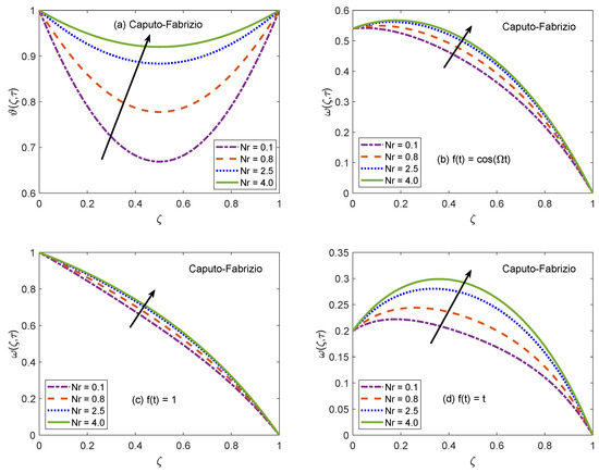 The suitability of fractional models for describing the practical physical processes is discussed with the assistance of Figure 6 and Figure 7. These figures portray the profiles of temperature and velocity distributions for multiple values of non-integer order/fractional parameter (). It is spotted that tends to raise the temperature profile of nanofluid and maximum value of temperature function is witnessed for , which is the classical model. Likewise, velocity is also an increasing function of for the cases of oscillatory and constant motion of the left channel wall. However, for the single acceleration flow condition, the behavior of velocity function is completely opposite and flow curve follows a dropping trend. This inverse behavior is primarily caused by the time difference. For single acceleration condition, the value of time is and for other presented cases, this value is . In terms of physical argument, the momentum boundary layer gets attenuated for small value of time, which leads to declining the flow profile when the motion of wall is directly varied with time. But, corresponding to the time advancement, the boundary layer expands and a speedy flow of nanofluid is observed. Besides, the flow and energy functions execute similar trends for both AB and CF models. Here, it is significant to emphasize memory capturing and self-similar properties of fractional operators. Figure 6 and Figure 7 suggest that as compared to conventional models, the dynamics of intricate processes are effectively described by fractional models because a fractional derivative is a useful tool to capture the memory effects. In addition, it is observed that a small modification in fractional-order leads to a significant variation in the results of the fractional model thus, an adequate agreement between theoretical calculations and experimental data can be established by appropriately adjusting the order of fractional derivative. Based on the aforementioned observations, it can be concluded that using fractional derivatives for modeling the flow problems is an efficient strategy to precisely anticipate the rheology and material properties of nanofluids. The participation of radiative heat flux for the development of momentum and thermal boundary layers is of vital importance. The consequences of incorporating the radiation phenomenon in the considered model are elucidated with the support of Figure 8 and Figure 9. It is described that the energy function reveals a notable rise for elevating values of radiation parameter . From the physical frame of reference, a weak thermal radiation causes the channel to drop the temperature of nanofluid because the gradient of temperature at the solid-nanofluid interface is not able to manage the sufficient heat transfer rate. As a result, the current temperature level is not maintained and the channel begins to release the energy. On the contrary, the thermal curve accepts an elevation as attains higher values. For this situation, a substantial escalation in the value of Rosseland absorption coefficient () takes place subject to constant magnitudes of and . Due to this escalation, the radiative heat flux () exhibits a dominant role and the process of heat flow through radiation occurs at a relatively quicker rate. As a consequence, the energy level of nanofluid particles is boosted and the curve associated with temperature distribution is escalated. The thermal curves in Figure 8a and Figure 9a are perfect graphical illustrations of this explanation. The graphs of velocity solutions depict that the transportation process is also influenced by thermal radiation. For three different velocity conditions, the flow of nanofluid is shown to be upsurged as the magnitude of increases. The extra amount of heat transferred to nanofluid as a result of a strong radiation phenomenon is responsible for this outcome. The molecules rapidly collide each other because of their higher kinetic energy and these collisions minimize the effectiveness of coherent attraction. The ability of nanofluid to withstand flow favoring forces tends to be minor as a consequence of this physical mechanism. Thus, the flow of nanofluid is accelerated. It is clear form the plots that variation in temperature profile due to alteration of is more significant than the variation in the velocity profiles because the parameter primarily appears in the heat equation and partial coupling of velocity and heat equations transfers it to velocity solution as well.