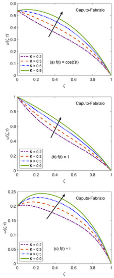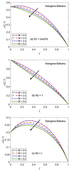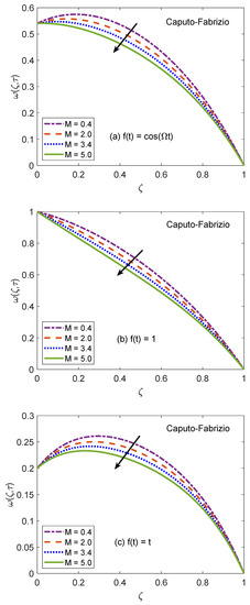 Figure 14 and Figure 15 are produced to highlight the effectiveness of nesting the channel in a permeable medium. This analysis is conducted by modifying the porosity parameter (K) while all other quantities remain constant. It is discerned that as the porosity of the medium increases, the flow of nanofluid takes place at higher velocity. The preceding outcome is the result of a number of causes. The primary one is the development of momentum regime because of insignificant resistive influence of nanofluid. Secondly, the capacity of a porous material to carry forward the considered nanofluid is improved due to augmented diameter of porous holes. A drastic dwindling in the strength of dragging force is another reason for observed behavior of velocity function . The impacts of porosity parameter on flow profile are identical for both fractional models. In this modern era of the development, efficiency and functionality of various industrial devices such as MHD pumps, generators, motors, and sensors depend on the interaction between the magnetic field and electrically conducting nanofluids. Therefore, it is necessary to conduct comprehensive studies on MHD flows to evaluate various aspects of such flows. A fundamental problem in this respect is the inspection of magnetic effects on boundary layers formed on different moving and static fluid conduits, for example, cylinders or channels. Thus, the role of a magnetic field in determining the behavior of boundary layer is investigated for the present problem and outcomes are imparted through Figure 16 and Figure 17. It is perceived that the boundary layer shrinks and the motion of nanofluid retards when the dominance of magnetic field enhances. In this work, the strength of the magnetic field is symbolized with magnetic parameter M. The influence of Lorentz force on velocity distribution of nanofluid is the primary physical explanation for this decrease in flow velocity. The Lorentz force, generally considered as a force of resitive nature is induced due to the occurrence of the intense magnetic impacts. Due to this force, nanofluid encounters dragging effects in an anti-flow direction and experiences much significant resistance. The dropping profile of the velocity function in Figure 16 and Figure 17 for different flow situations endorse the aforementioned physical arguments. It is visualized in Figure 18 that the AB operator based fractional temperature and velocity field solutions developed through Zakian’s algorithm show a complete accordance with those anticipated through Durbin’s and Stehfest’s algorithms. Figure 19 reveals that the same observation is also true for the CF operator based solutions. Hence, it can be concluded that solutions are authentic and reliable.