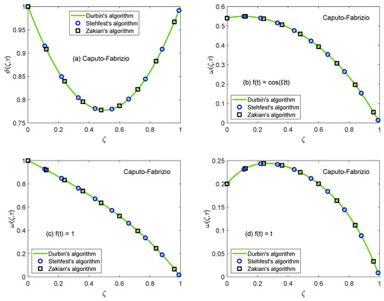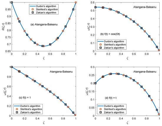 The temperature and velocity expressions in Equations (24), (30), (38) and (46) for two different fractional models involve multiple complex functions of Laplace frequency “q”. Thus, the present form of these expressions is not optimal for inverting them in real-time coordinate analytically. Generally, these situations occur in the case of fractional models because the application of the Laplace transform on non-integer order equations yields much complicated relations as compared to conventional models. When such complexities appear in engineering problems, the use of numerical Laplace transform is the most powerful strategy for dealing with them. In this work, the solutions are transmuted back to the principal domain by operating the well-known Zakian’s Laplace inversion algorithm [47]. The objectives of certifying the developed solutions and ensuring reliability are achieved by the dint of Stehfest’s [48] and Durbin’s algorithms [49]. The same methodology is followed to obtain the tabulated values of Nusselt number and skin friction coefficient.