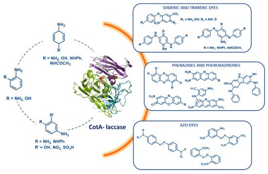 - Sousa, A.C.; Baptista, S.R.; Martins, L.O.; Robalo, M.P. Synthesis of azobenzene dyes mediated by CotA laccase. Chem. Asian J. 2019, 14, 187–193. [Google Scholar] [CrossRef] [PubMed]