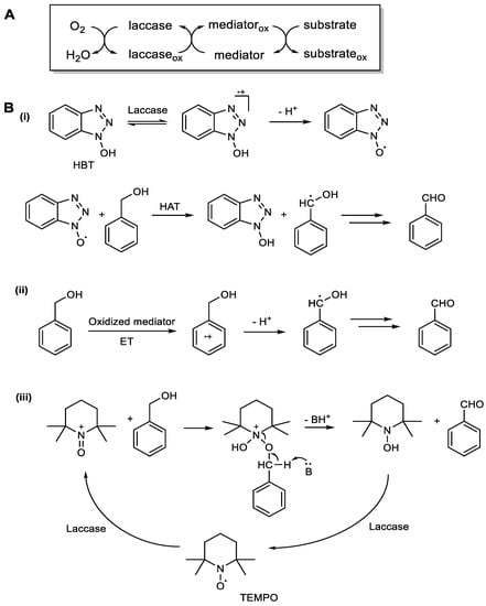 - Astolfi, P.; Brandi, P.; Galli, C.; Gentili, P.; Gerini, M.F.; Greci, L.; Lanzalunga, O. New mediators for the enzyme laccase: Mechanistic features and selectivity in the oxidation of non-phenolic substrates. New J. Chem. 2005, 29, 1308–1317. [Google Scholar] [CrossRef]