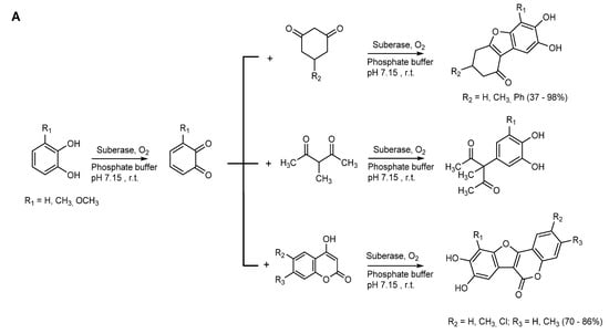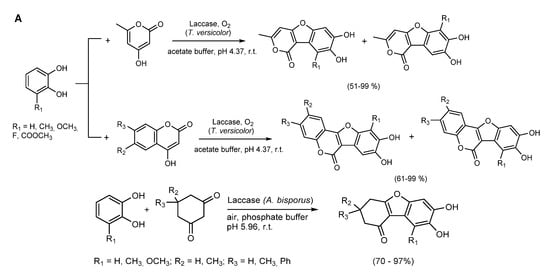 - Leutbecher, H.; Conrad, J.; Klaiber, I.; Beifuss, U. O-Heterocycles via laccase-catalyzed domino reactions with O2 as the Oxidant. Syn. Lett. 2005, 20, 3126–3130. [Google Scholar] [CrossRef]