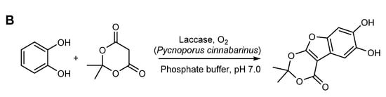 - Kidwai, M.; Jain, A.; Sharma, A.; Kuhad, R.C. Laccase-catalysed reaction between Meldrum’s acid and catechols/hydroquinones—An investigation. Compt. Rendus Chim. 2013, 16, 728–735. [Google Scholar] [CrossRef]