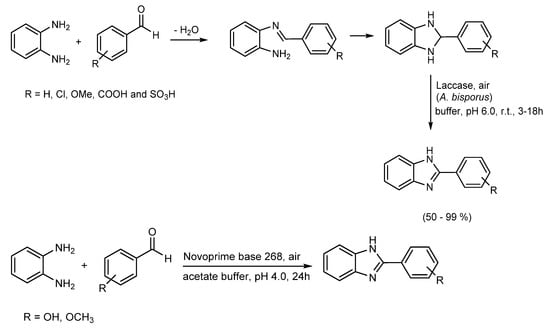 - Maphupha, M.; Juma, W.P.; Koning, C.B.; Brady, D. A modern and practical laccase-catalysed route suitable for the synthesis of 2-arylbenzimidazoles and 2-arylbenzothiazoles. RSC Adv. 2018, 8, 39496–39510. [Google Scholar] [CrossRef]