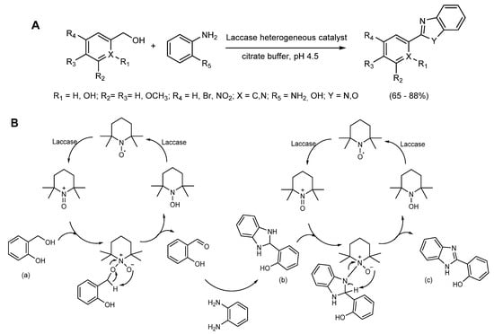 - Mogharabi, M.; Kiani, M.; Aryanejad, S.; Imanparast, S.; Amini, M.; Faramarzi, M.A. Magnetic heterogeneous biocatalyst composed of immobilized laccase and 2,2,6,6-tetramethylpiperidine-1-oxyl (TEMPO) for green one-pot cascade synthesis of 2- substituted benzimidazole and benzoxazole derivatives under mild reaction conditions. Adv. Synth. Catal. 2018, 360, 3563–3571. [Google Scholar] [CrossRef]
