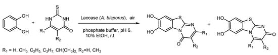 - Abdel-Mohsen, H.T.; Conrad, J.; Harms, K.; Nohr, D.; Beifuss, U. Laccase-catalyzed green synthesis and cytotoxic activity of novel pyrimidobenzothiazoles and catechol thioethers. RSC Adv. 2017, 7, 17427–17441. [Google Scholar] [CrossRef]