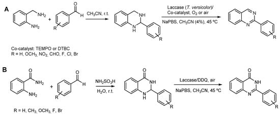 - Saadati, S.; Ghorashi, N.; Rostami, A.; Kobarfard, F. Laccase-based oxidative catalytic systems for the aerobic aromatization of tetrahydroquinazolines and related N-heterocyclic compounds under mild conditions. Eur. J. Org. Chem. 2018, 30, 4050–4057. [Google Scholar] [CrossRef]