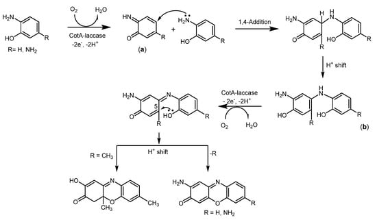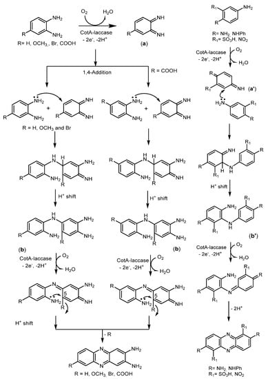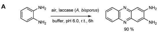 - Sousa, A.C.; Oliveira, M.C.; Martins, L.O.; Robalo, M.P. A Sustainable synthesis of asymmetric phenazines and phenoxazinones mediated by CotA-laccase. Adv. Synth. Catal. 2018, 360, 575–583. [Google Scholar] [CrossRef]