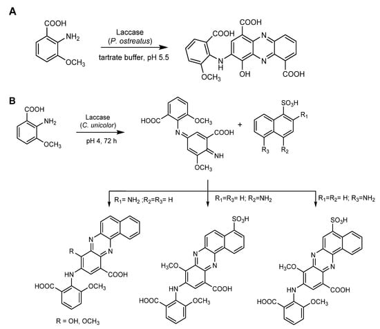 - Wlizło, K.; Polak, J.; Jarosz-Wilkołazkaa, A.; Pogni, R.; Petricci, E. Novel textile dye obtained through transformation of 2-amino-3-methoxybenzoic acid by free and immobilised laccase from a Pleurotus ostreatus strain. Enz. Microb. Technol. 2020, 132, 109398. [Google Scholar] [CrossRef]