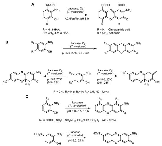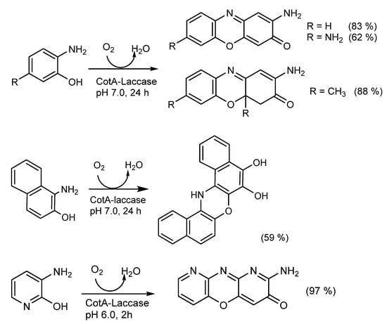 - Sousa, A.C.; Oliveira, M.C.; Martins, L.O.; Robalo, M.P. Towards the rational biosynthesis of substituted phenazines and phenoxazinones by laccases. Green Chem. 2014, 16, 4127–4136. [Google Scholar] [CrossRef]