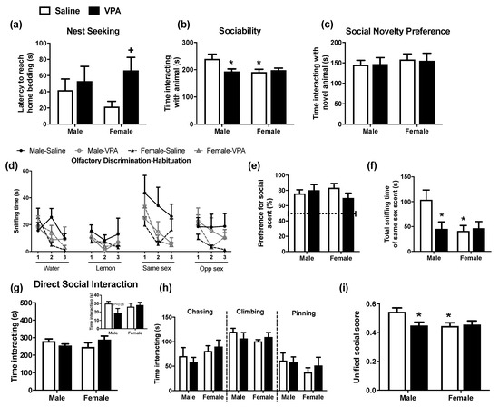 2.1. Prenatal VPA Exposure Induces Changes in Social Responding at Different Developmental Periods for Male and Female Rats