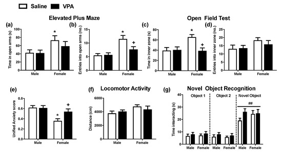 2.2. Prenatal VPA Exposure Induces Anxiety-Like Behaviour in Female, But Not Male, Adolescent Rats
