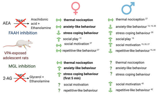 - Melancia, F.; Schiavi, S.; Servadio, M.; Cartocci, V.; Campolongo, P.; Palmery, M.; Pallottini, V.; Trezza, V. Sex-specific autistic endophenotypes induced by prenatal exposure to valproic acid involve anandamide signalling. Br. J. Pharmacol. 2018, 175, 3699–3712. [Google Scholar] [CrossRef]