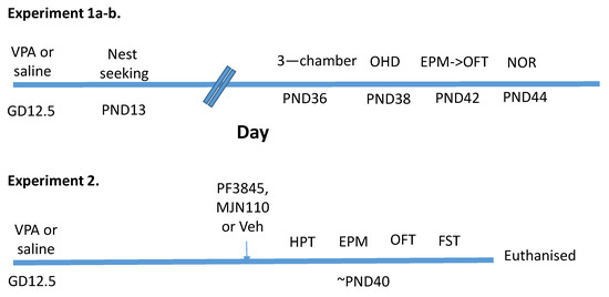 - Gzielo, K.; Potasiewicz, A.; Holuj, M.; Litwa, E.; Popik, P.; Nikiforuk, A. Valproic acid exposure impairs ultrasonic communication in infant, adolescent and adult rats. Eur. Neuropsychopharmacol. 2020, 41, 52–62. [Google Scholar] [CrossRef]