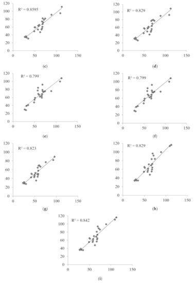 Correlations between the MPA AUCtotal and the MPA AUCpred calculated for children with nephrotic syndrome using MLR LSS equations found in the literature that fulfilled the criteria for %MPE and %MAE ±15%; (a) AUCpred = 7.4 + 2.3 × C0 + 1.2 × C1 + 2.3 × C3 + 4.4 × C6 [30]; (b) AUCpred = 9.328 + 1.311 × C1 + 1.455 × C2 + 2.901 × C4 [43]; (c) AUCpred = 10.6 + 1.1 × C1 + 1.1 × C2 + 2.0 × C4 + 3.9 × C6 [30]; (d) AUCpred = 5.92 + 1.10 × C1 + 1.01 × C2 + 1.77 × C4 + 4.80 × C6 [28]; (e) AUCpred = 8.22 + 3.16 × C0 + 0.99 × C1 + 1.33 × C2 + 4.18 × C4 [32]; (f) AUCpred = 8.217 + 3.163 × C0 + 0.994 × C1 + 1.334 × C2 + 4.183 × C4 [8]; (g) AUCpred = 10.229 + 0.925 × C1 + 1.750 × C2 + 4.586 × C6 [29]; (h) AUCpred = 7.73 + 0.94 × C1 + 2.55 × C2 + 5.48 × C6 [32]; (i) AUCpred = 10.75 + 0.98 × C1 + 2.38 × C2 + 4.86 × C6 [33].