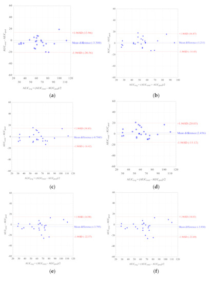 To assess the predictive performance of LSSs available in the literature, we calculated r2 as well as the bias and precision for AUCpred as the mean relative prediction error (%MPE) and the percentage of the mean absolute relative prediction error (%MAE), respectively, both with 95% confidence intervals. According to the literature, precision and bias ±15% were considered acceptable [22,59,60], although some authors defined the clinical acceptance as ±20% [18] or even as ±33% [61]. Although it does not translate into clinical practice, lower percentages of precision and bias result in more accurate calculations. We also calculated the percentage of the AUCpred within ±15% of the AUCtotal for each equation to analyze the agreement between the AUCpred and the AUCtotal. The equations used in the analysis were as follows [51,62]: