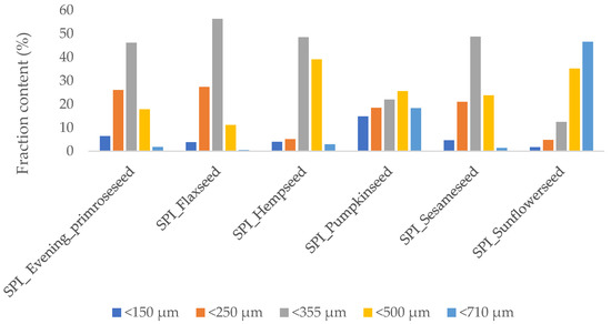 The oilseed flours’ particle size distribution was determined by sieve analysis with a vibratory sieve shaker model AS 200 (Retsch, Katowice, Poland) using a sieve aperture of 150, 150, 355, 500 and 710 μm for 10 min of sieving time. Table 6 shows the basic chemical composition of oilseed flours that were used to obtain edible films.