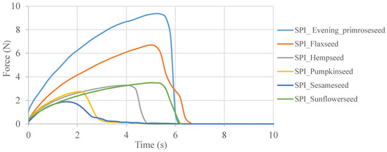 Force–time curves occurring during the tensile strength analysis of soy protein isolate–oilseed flour films.