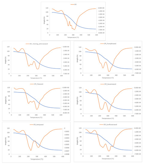 Thermogravimetric analysis (TGA) (blue) and derivative thermogravimetry (dTG) (orange) curves of films of soy protein isolate and oilseed flour.